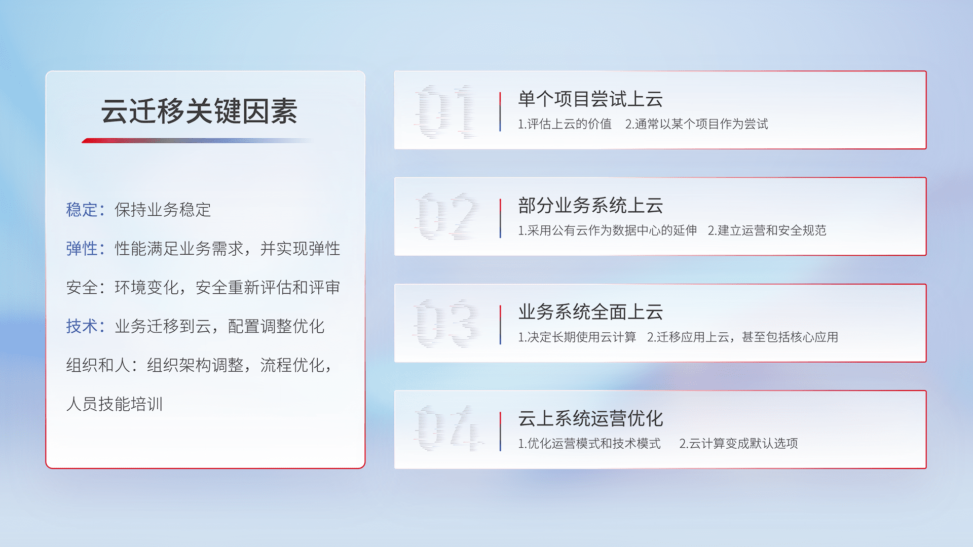 结合实际业务,,从规划设计、、云平台选型、、云原生改造、、数据迁移、、集成交付,,迁移全过程为客户识别最佳上云路径,,做好风险识别管理,,,,设计网络架构、、身份权限、、安全审计合规、、操作审计、、日志审计、、监控告警策略、、、、多站点容灾设计等,,,对云上基础设施进行整体规划,,提升IT治理水平,,以满足弹性、、、、高可用、、、、高性能的需求。。。
